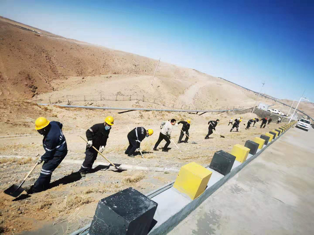 本次活動重點(diǎn)對基礎(chǔ)壩兩側(cè)坡面進(jìn)行綜合治理,治理長度約1.5公里。面對坡陡、風(fēng)大、黃沙亂舞的工作環(huán)境,黨員干部不懼困難、以身作則、俯沖一線,帶頭撿拾垃圾、清理尾砂、覆土灑水以及對安全警示牌進(jìn)行維護(hù)保養(yǎng)。廣大職工緊跟其后,或一字排開,或矩陣展開,忙碌的身影遍布整個坡面,鏟車的轟鳴聲、鐵锨的吱吱聲與狂風(fēng)的呼嘯聲琴簫合奏,在藍(lán)天、斜陽和荒山的襯托下,勾勒出一幅“聲與色”、“動與靜”相得益彰的勞動生產(chǎn)畫卷。